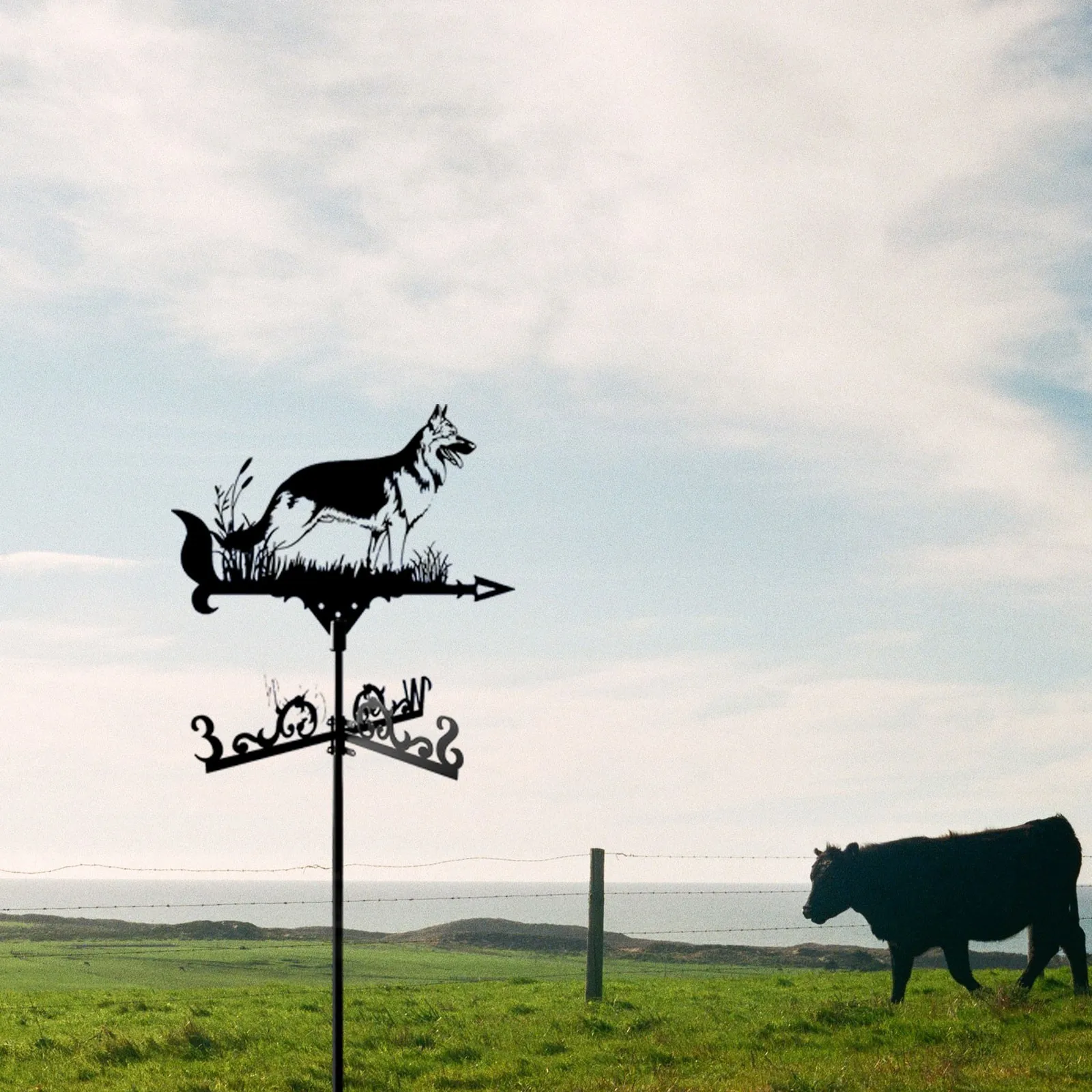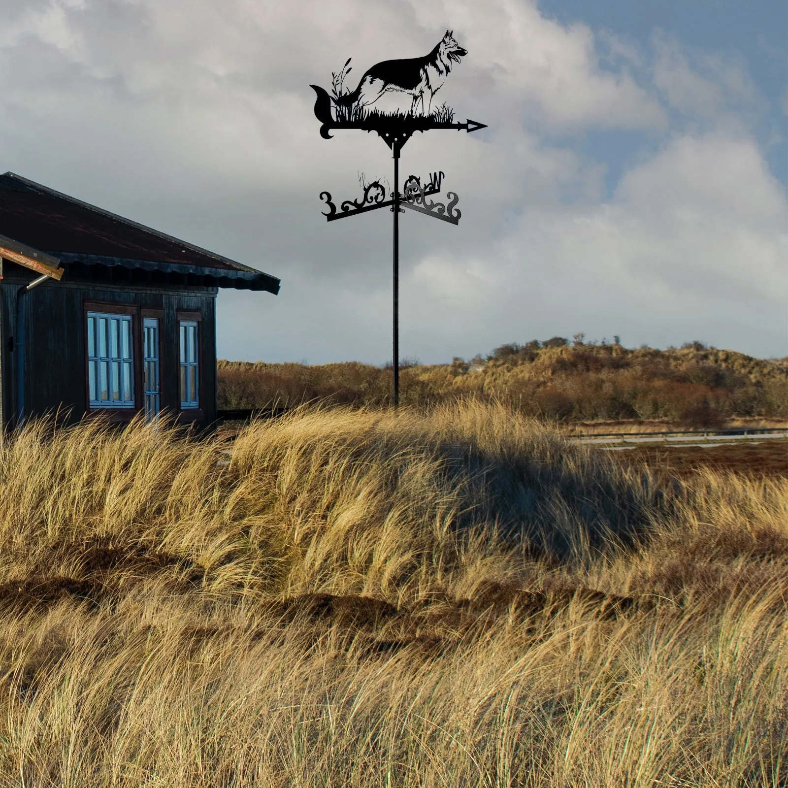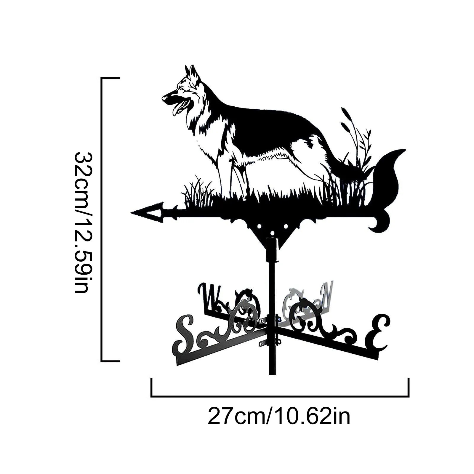 feature:【SHEPHERD DOG WEATHER VANE - Architectural style】 This beautiful weather vane has been masterfully crafted from metal and varnished to long-lasting color and dimension to your backyard. Our weathervane is not beautiful, but also useful to know which direction the wind is going. A weather vane of this size is perfect for your house, garage, , barn or pavilion.